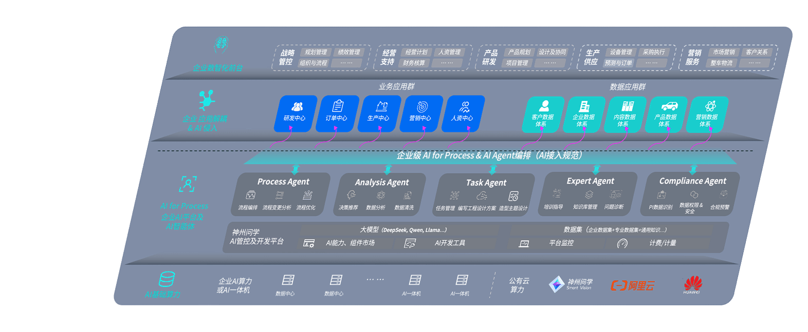 端到端的一站式AI工作空间深度融合了从企业战略规划到日常经营的全流程业务板块,,,,定向解决车企内部领域多、、、部门多、、、、链条长、、、场景碎片化等难题,,支持车企快速构建以AI为核心的生产力写作体系,,,实现任务执行与AI能力的无缝集成与交互