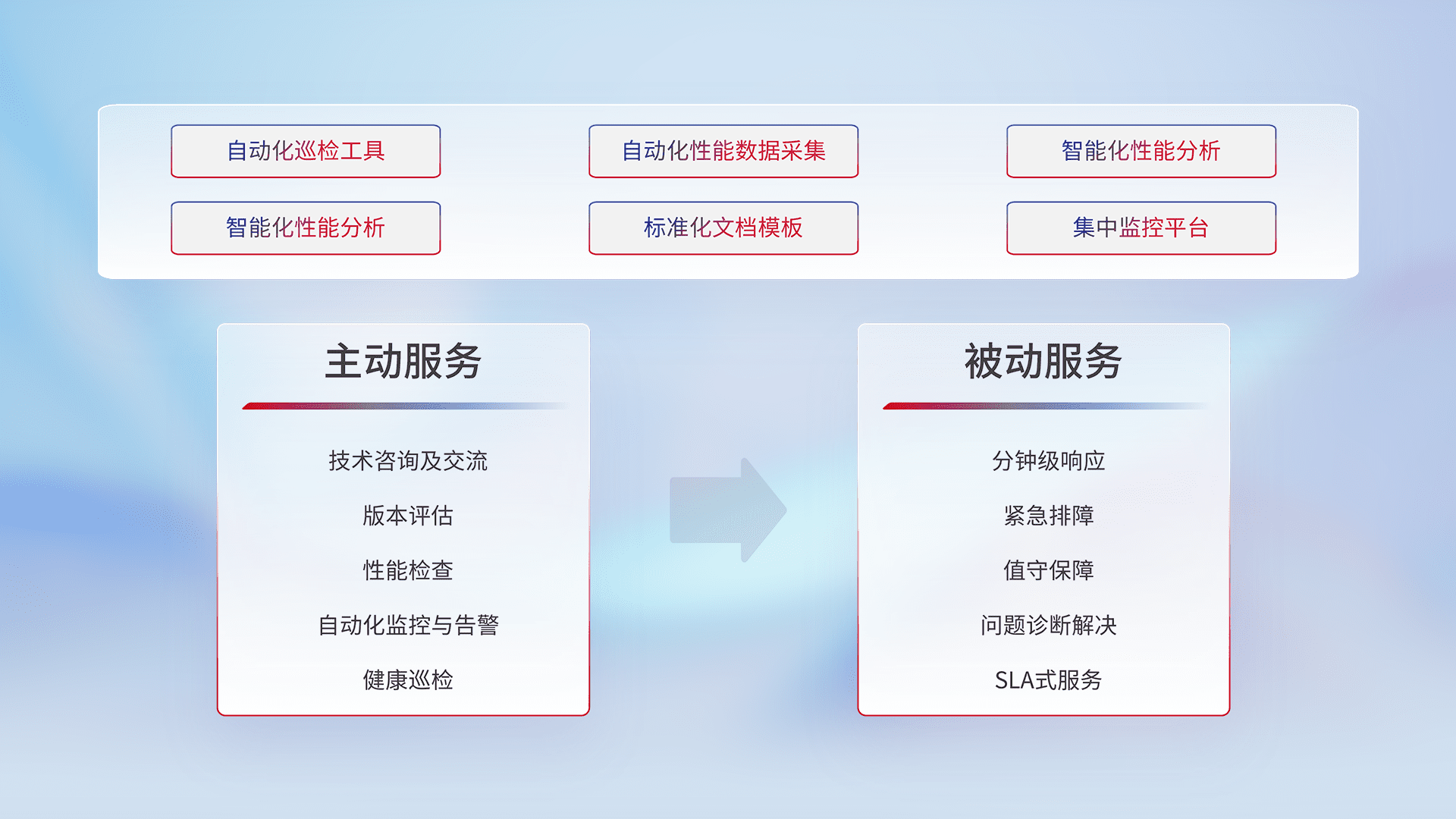 智能化工具和标准化文档,,保障服务质量,,,提供主动服务(包含技术咨询、、版本评估、、性能检查、、、、自动化监控与告警、、、健康巡检)和被动服务包含(分钟级响应、、、紧急排障、、、、值守保障、、、、问题诊断解决、、、SLA服务)。。。